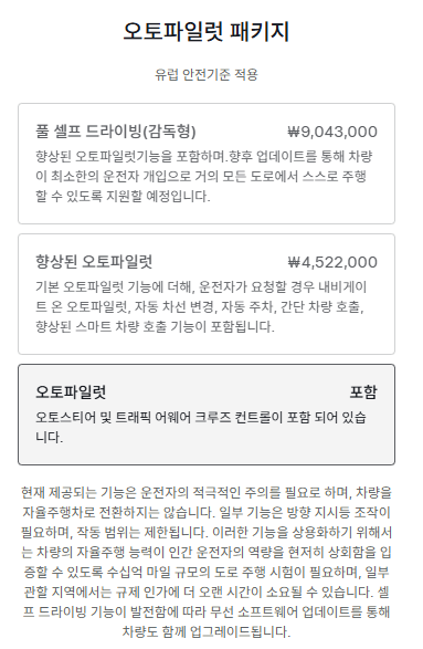 여전히 현재 기준으로는 북미와는 다르게 FSD 뿐만 아니라 EAP 옵션도 구매 가능하며 가격은 다른 모델들과 변화 없습니다.